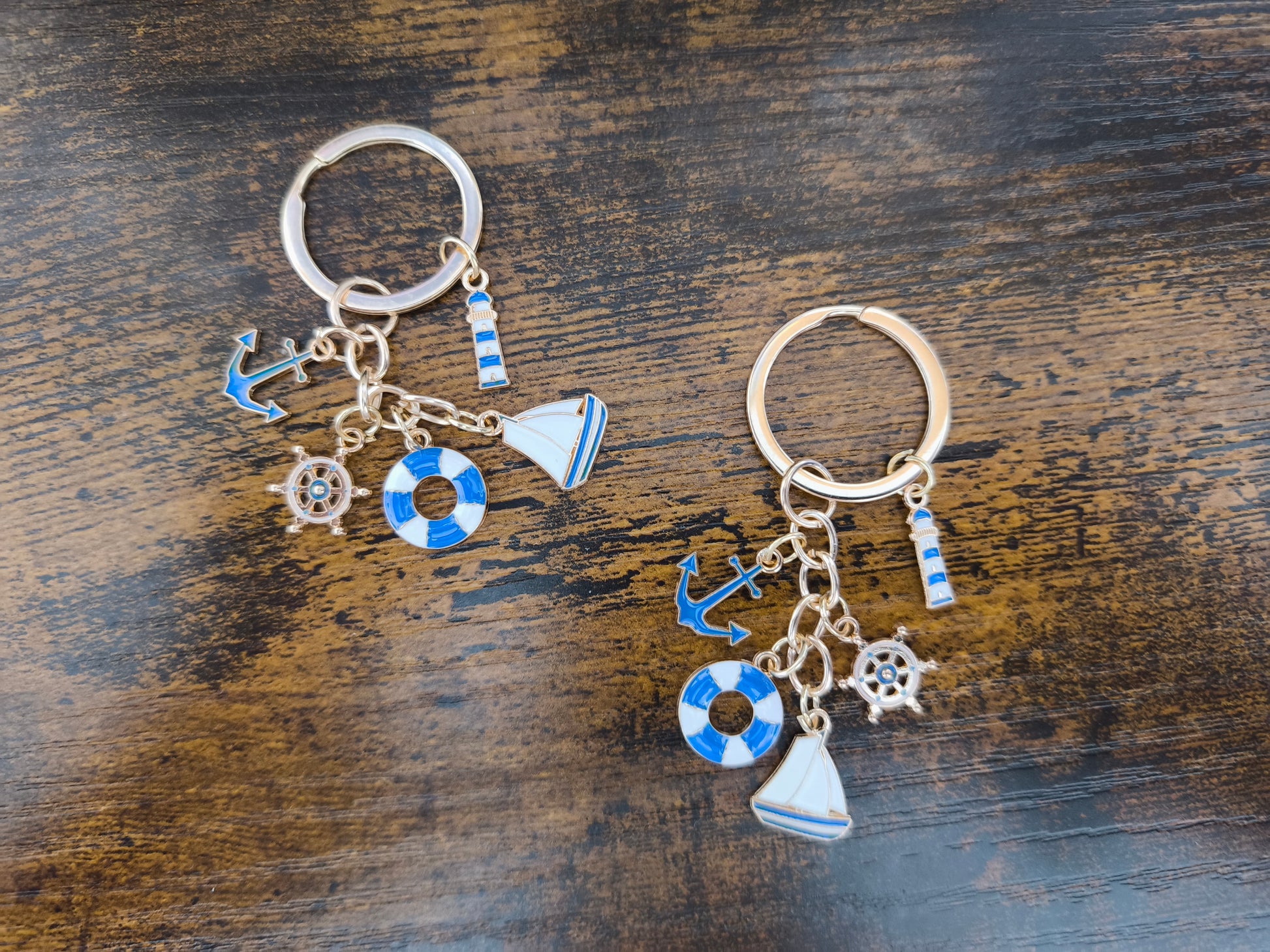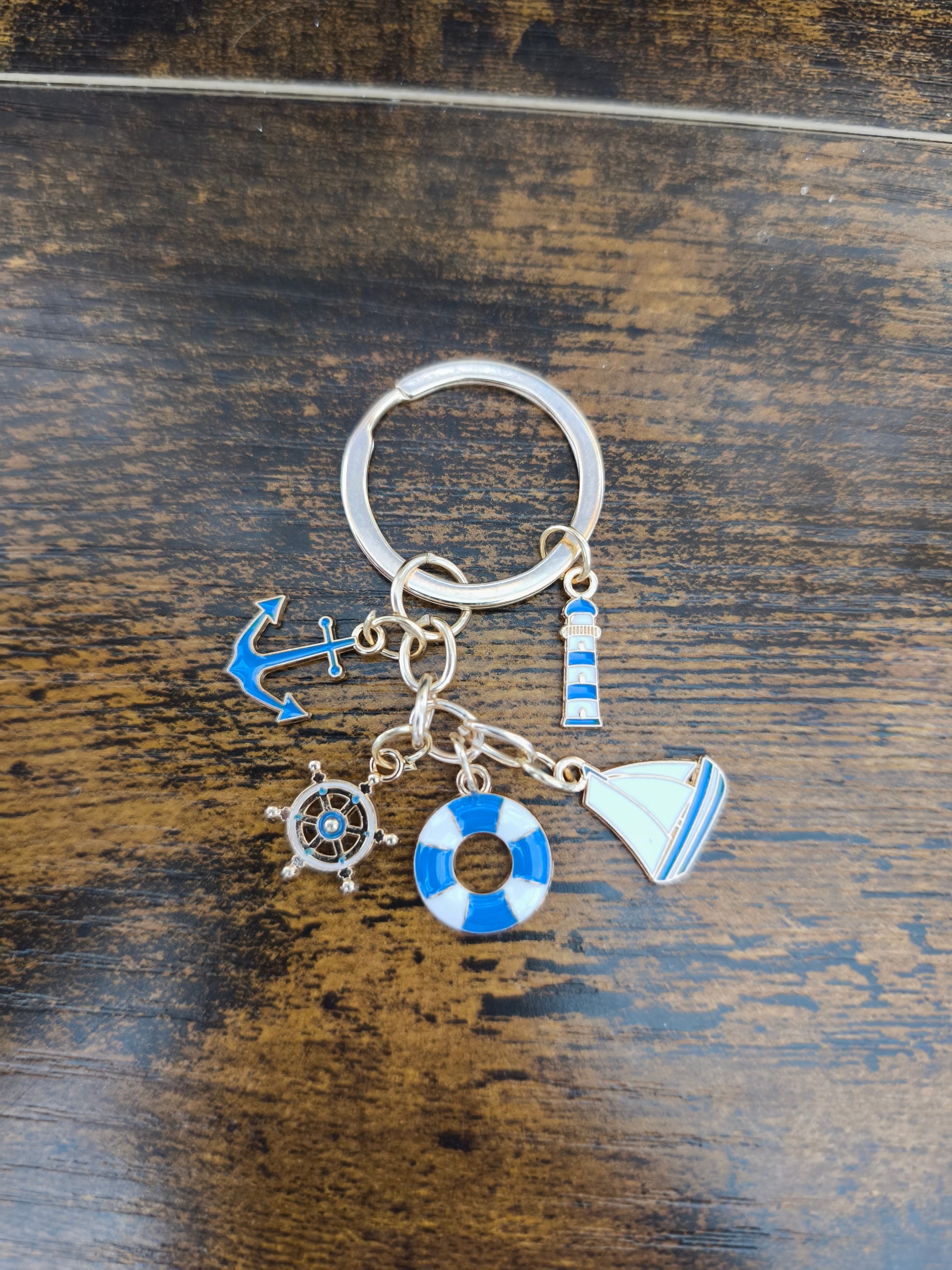 Hol dir das Meer nach Hause! Dieser detailreiche Schlüsselanhänger vereint alle Symbole einer echten Küstenbrise: Leuchtturm, Rettungsring, Boot, Steuerrad und Anker an einem Bund.